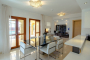 The adjacent dining area with modern dining table and chairs is separated from the kitchen by a handy sideboard.